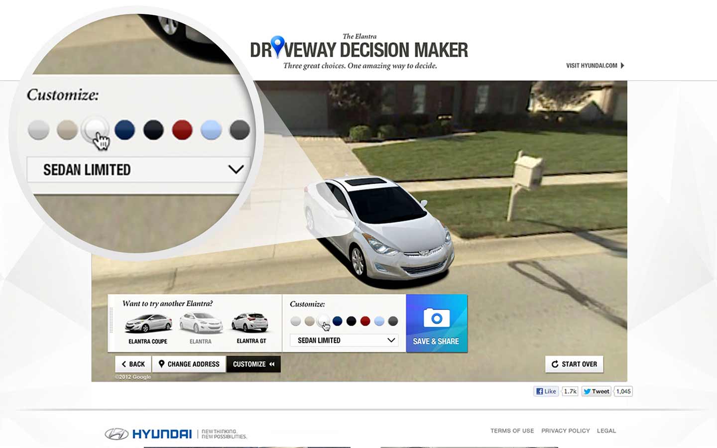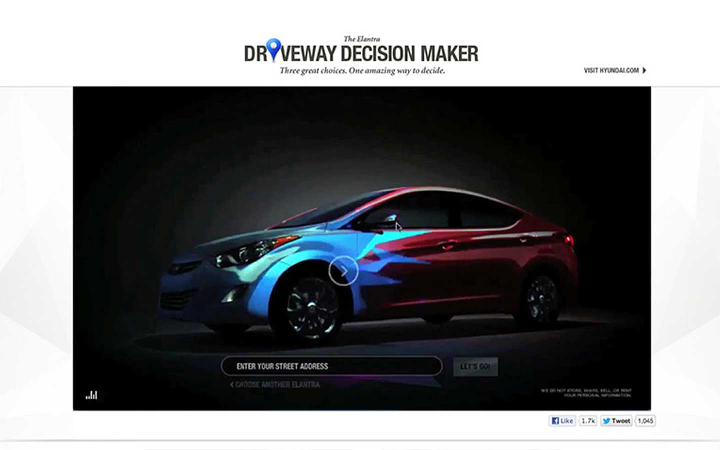 Evidence that we were helping make these decisions easier for people was seen in sales figures for Elantra that were, for the first time, at higher volume than Sonata which has been Hyundai’s traditional sales leader. Other evidence that we were having an impact came in the form of big traffic numbers despite little media weight driving to the experience. The press took notice as did the industry with numerous international awards including The One Show’s Best Automotive Digital Marketing of the Year Award in 2013.