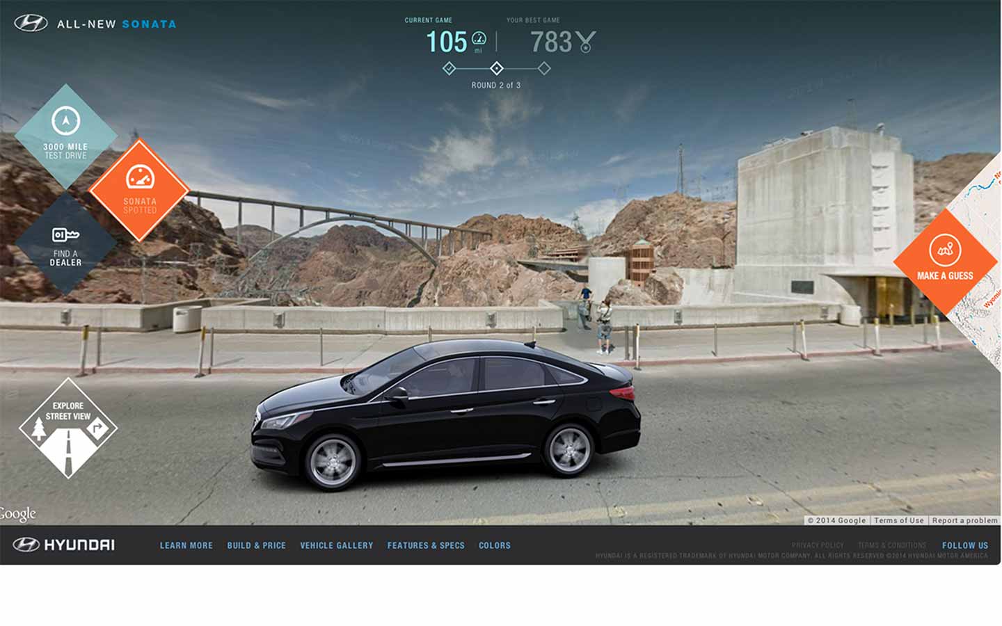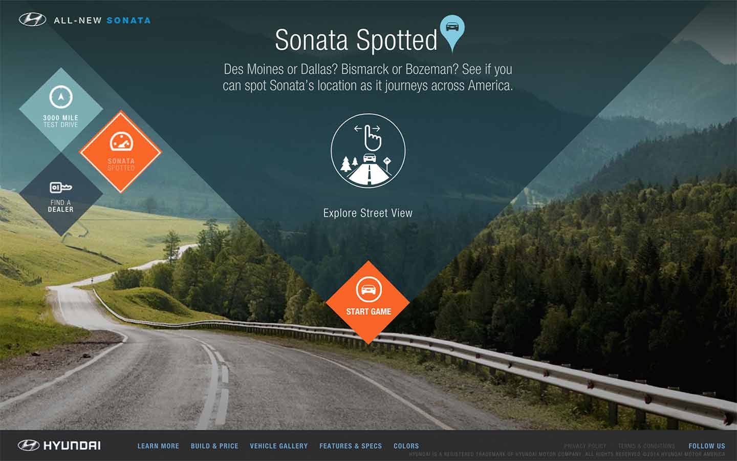 Another big idea that fit perfectly into the launch platform turned the focus towards interactivity and gamification – and of course it had everything to do with Sonata & road trips across the nation. But when we found a way to pull in the powerful capabilities an magic of Google Maps & Street View we saw a fun and competitive experience.